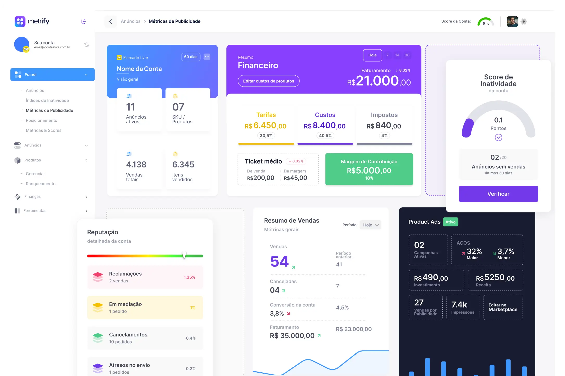 Tenha uma visão clara das finanças: custos, tarifas, impostos, ticket médio e mais no dashboard interativo Metrify.