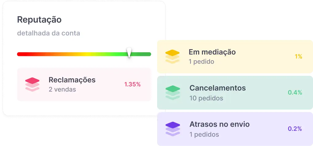 Acompanhe sua reputação: em mediação, cancelamentos, atrasos no envio, reclamações e mais.