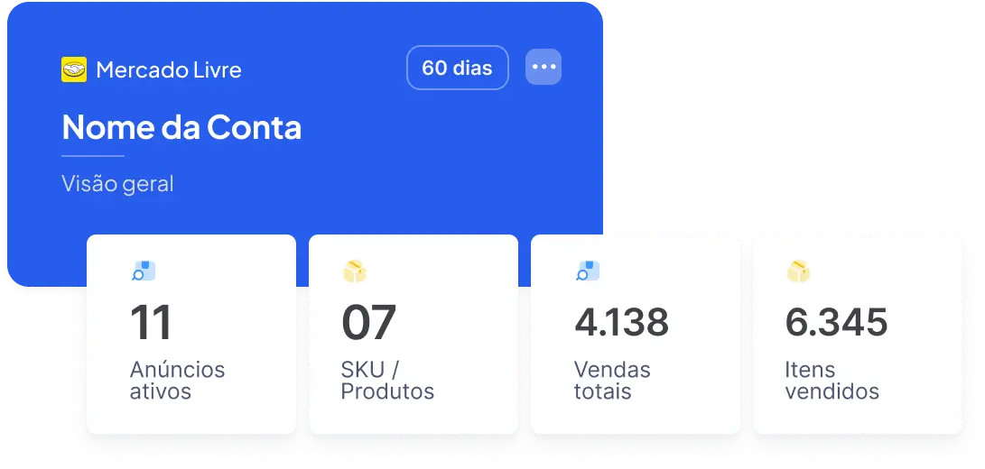 Tenha uma visão clara das finanças: SKU/Produtos, anúncios ativos, vendas totais, itens vendidos e mais.